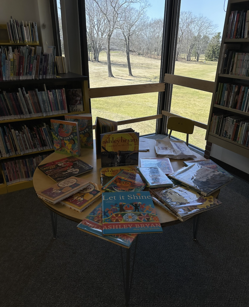 This is the corner of the Library that I operated in for the South Portland MS field trip. Here, I ran an activity surrounding the artist Ashley Bryan. With four groups of about ten 5th grade students, I believe this was the second time running an activity completely on my own, without the guidance of a Teaching Artist. I felt comfortable running this activity, though I think if it was early on in the internship I might not have had the confidence to do so. My main job was to ensure students were actually doing the activity, (writing, drawing, reading) and not distracting their friends too much.
