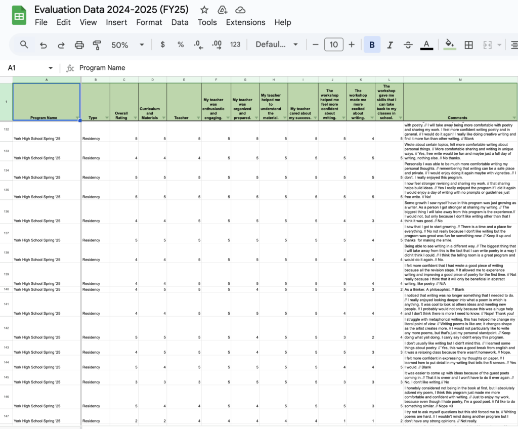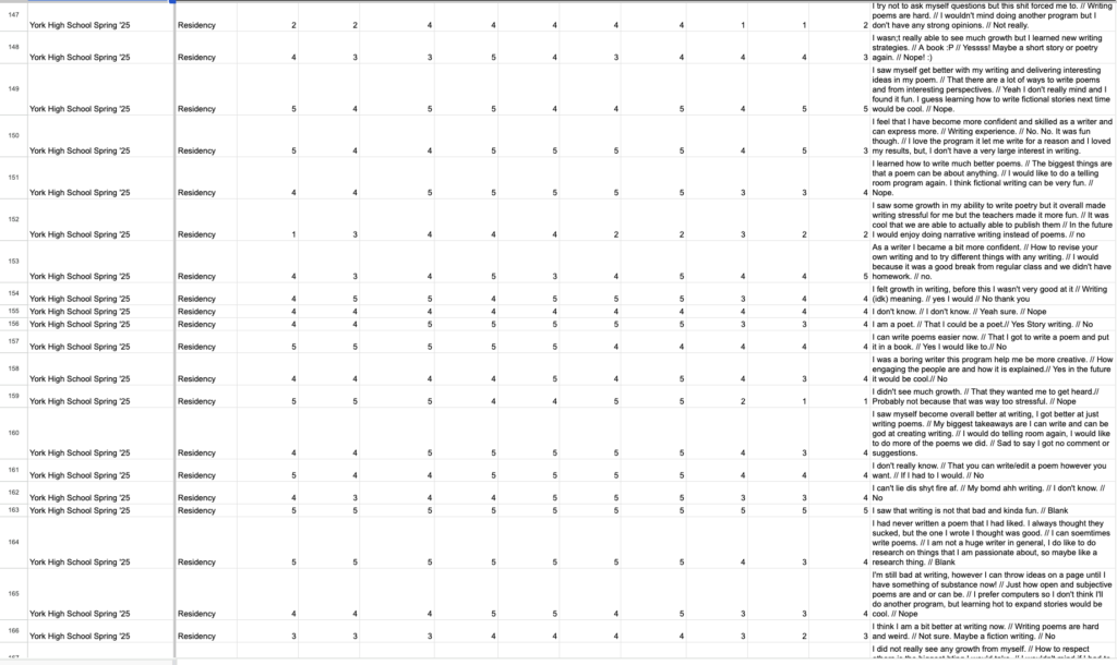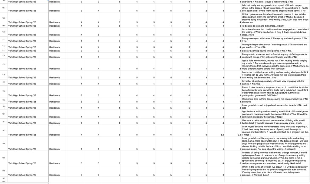 This past week I have been completing a lot of evaluation data. The above pictures show what about an hour of this work looks like. The Telling Room utilizes this data and feedback to learn what can be changed and what should be kept the same in programs. These entries are from the residency at York High School. Currently, the stack of incomplete evaluation data is large, and still growing; my goal is to get through as much of it as I can before the end of my time at The Telling Room.
